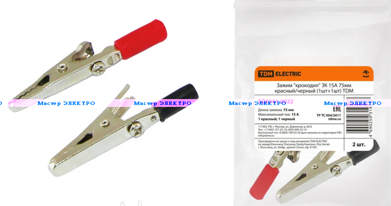 Зажим "крокодил" ЗК 15А 75мм красный/черный (1шт+1шт)